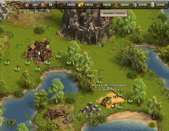 - le chemin virtuel qui apparaîtra lorsque vous voudrez construire un bâtiment, et qui vous indiquera le chemin parcouru par votre Settler travailleur, ainsi que le temps nécessaire pour aller jusqu'à l'entrepôt le plus proche